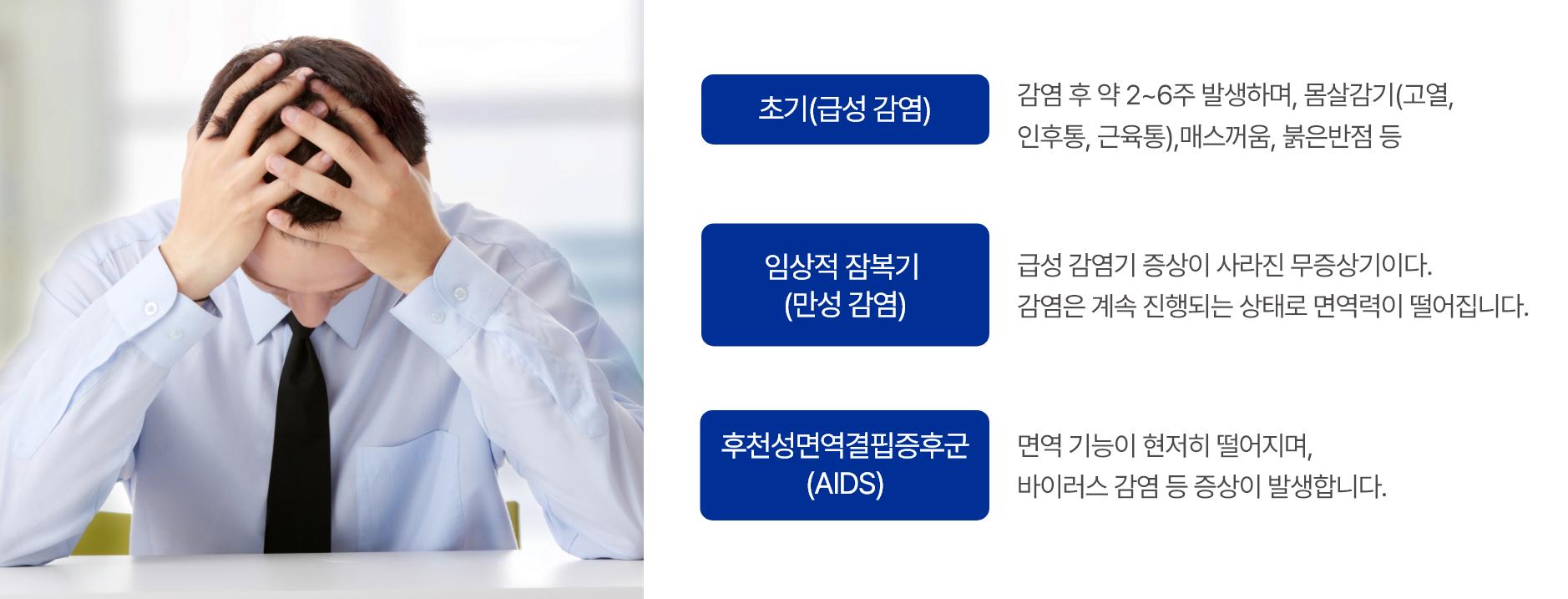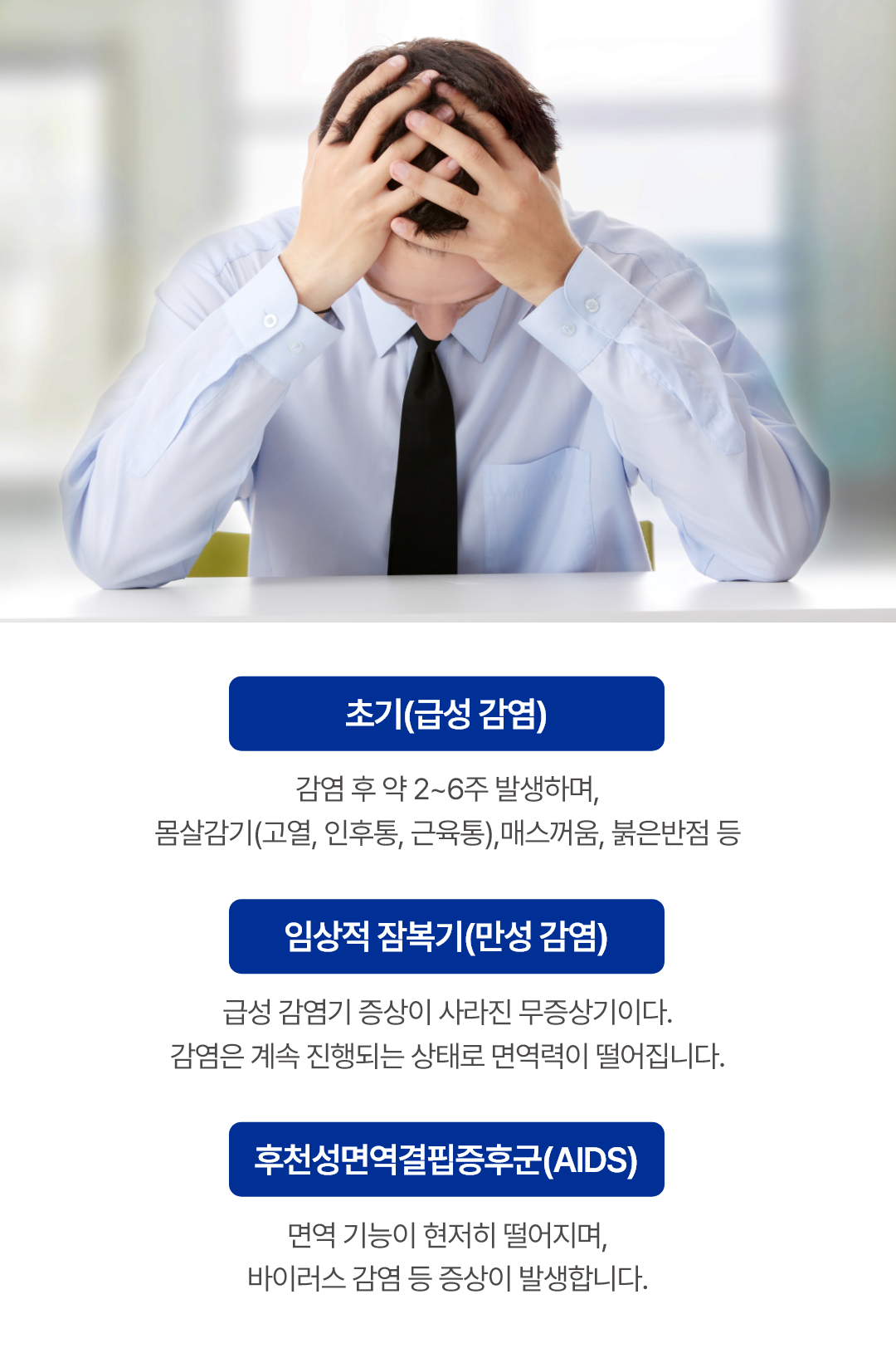 HIV 감염은 초기 감기와 비슷한 증상이 나타나며, 이후 수년간 큰 증상 없이 지나가는 경우가 많습니다.